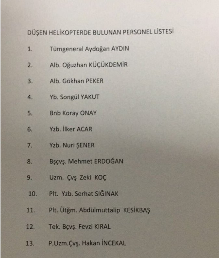 Həmin faciəvi qəza nəticəsində helikopterdə olan qəhrəman silah yoldaşlarımızın şəhid olması barədə məumat verilib. Qəzada dünyasını dəyişən həebçilərimizə Allahdan rəhmət, qohumlarına, yaxınlarına, Türk Silahlı Qüvvətlərinə və böyük Türk millətinə başsağlığı verir və səbr arzulayırıq.” – deyə Baş qərargahın bəyanatında bildirilir.